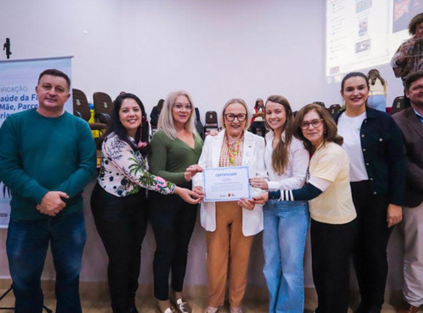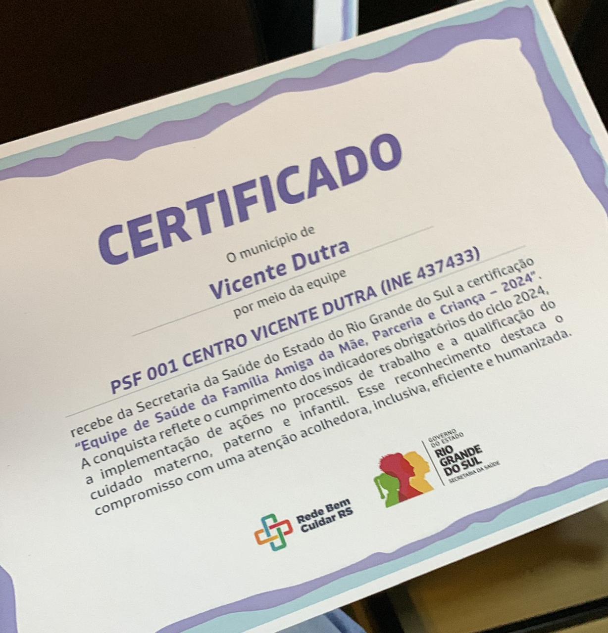 O município de Vicente Dutra foi reconhecido como Equipe de Saúde da Família Amiga da Mãe, Parceria e Criança - 2024. A certificação dos municípios da 2ª Coordenadoria Regional de Saúde, ocorreu ontem, dia 21/05 no município de Tenente Portela, sendo entregue pela Secretária de Saúde do Rio Grande do Sul Arita Bergmann. Essa certificação é trabalho de todos os profissionais da Rede Bem Cuidar.