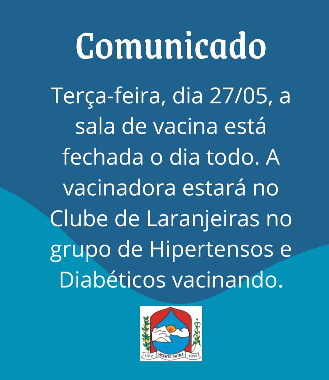 No dia 27/05 terça-feira, sala de Vacinas estará fechada o dia todo.