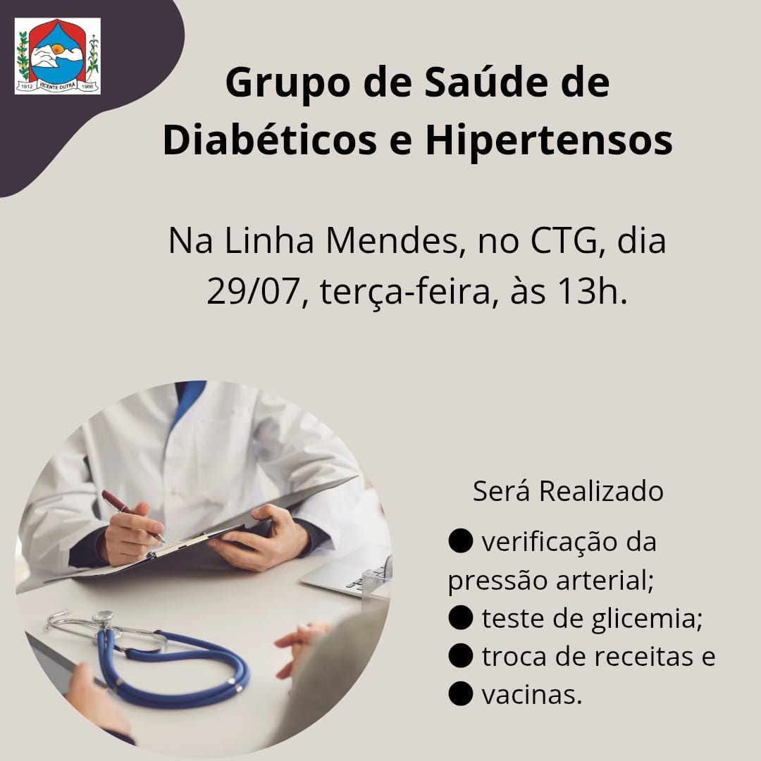 Grupo de Saúde para Diabéticos e Hipertensos, na Linha Mendes, no CTG, dia 29/07, terça-feira, às 13h. Será realizado verificação da pressão arterial, teste de glicemia, troca de receitas e vacinas.