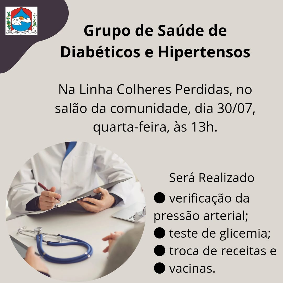 Grupo de Saúde para Diabéticos e Hipertensos, na Linha Colheres Perdidas, no salão da comunidade, dia 31/07, quinta-feira, às 13h. Será realizado verificação da pressão arterial, teste de glicemia, troca de receitas e vacinas.