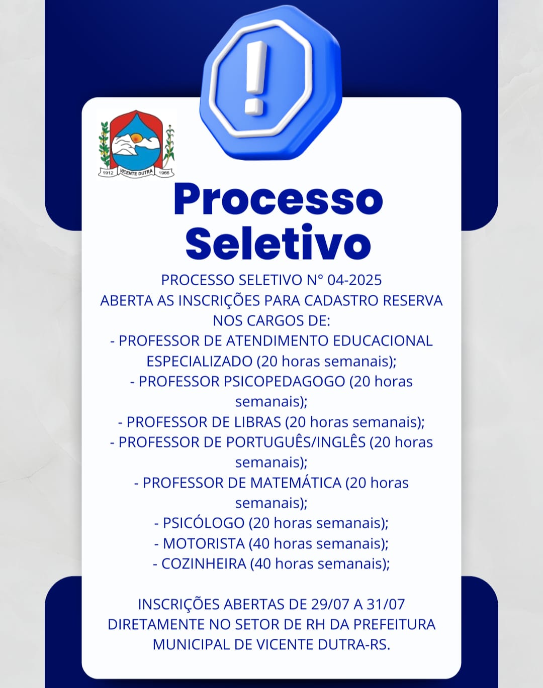 INSCRIÇÕES ABERTAS DE 29/07 A 31/07 DIRETAMENTE NO SETOR DE RH DA PREFEITURA MUNICIPAL DE VICENTE DUTRA-RS.