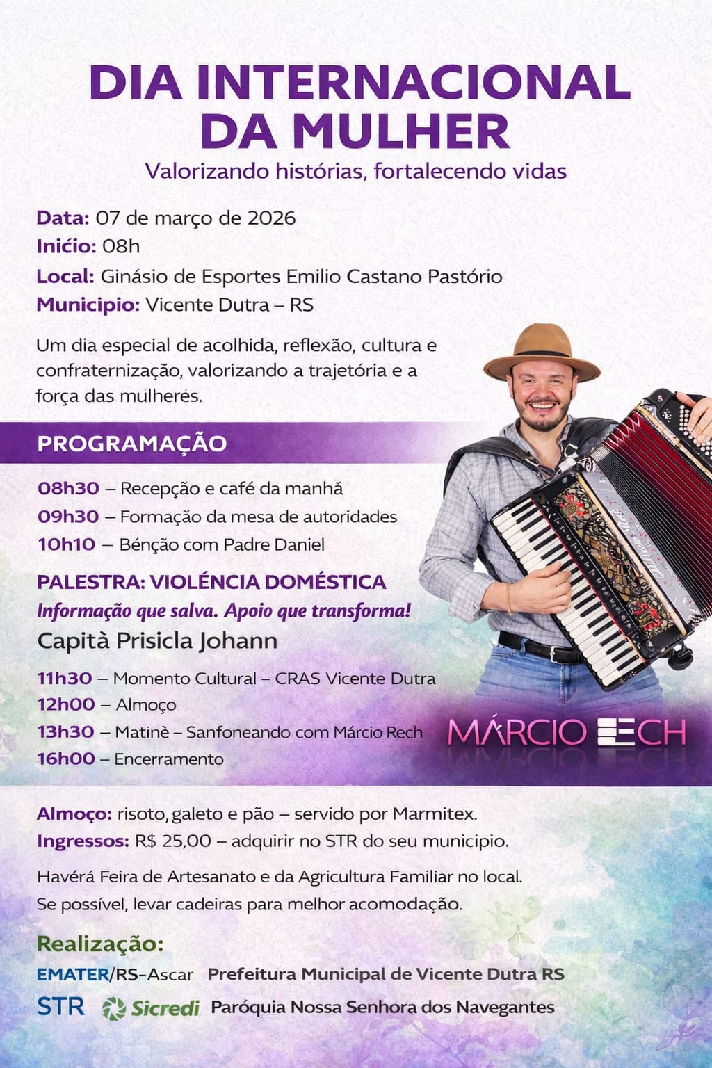 O encontro é uma realização da EMATER/RS-Ascar, Prefeitura Municipal de Vicente Dutra, STR, Sicredi e Paróquia Nossa Senhora dos Navegantes, reafirmando o compromisso conjunto com a valorização e o fortalecimento das mulheres da região.