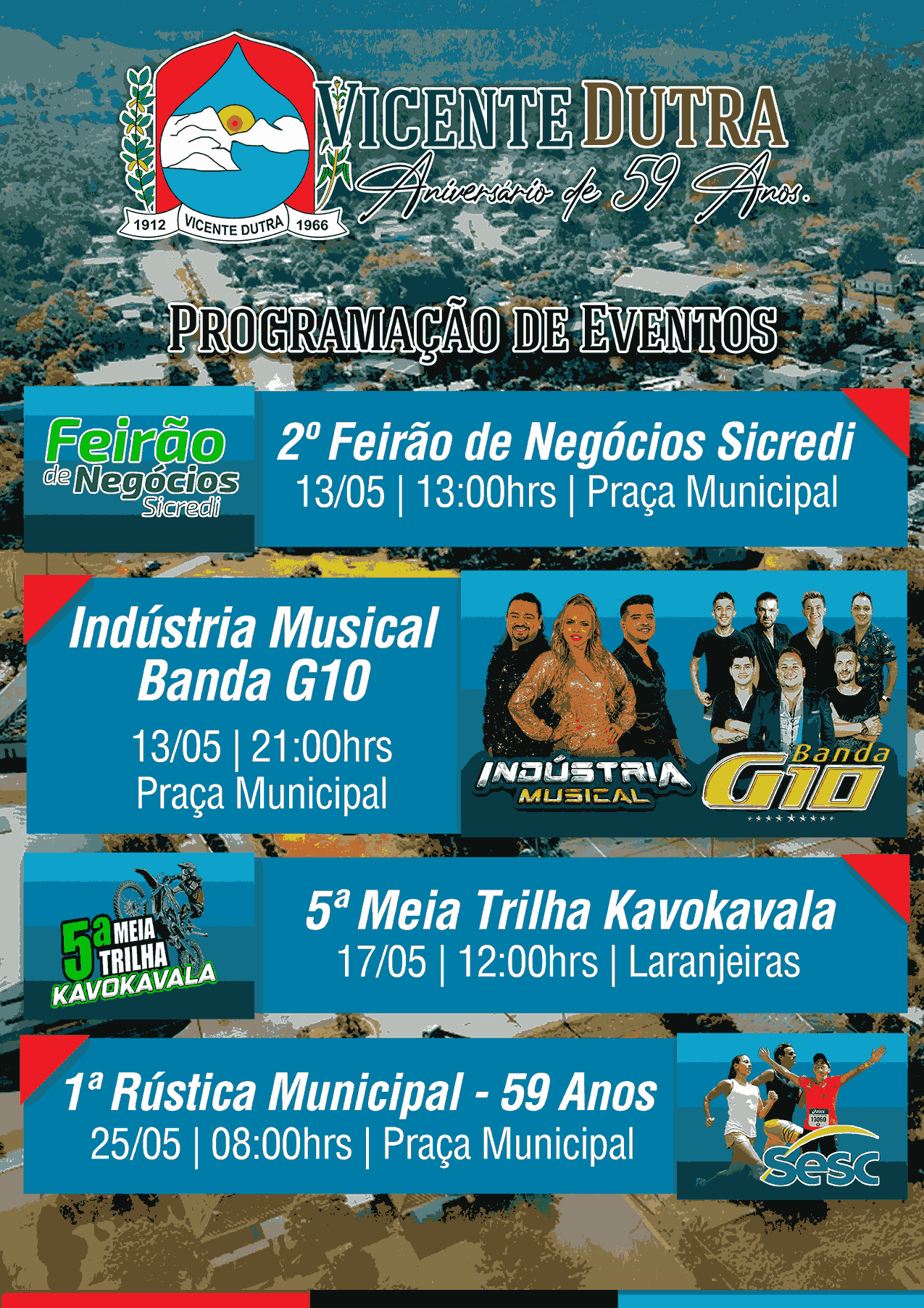 A Administração Municipal convida toda a população para prestigiar e participar dos eventos que celebram a história, a cultura e o crescimento de Vicente Dutra. Mais do que uma festa, essa é uma homenagem ao povo trabalhador e acolhedor que constrói, todos os dias, um futuro melhor para nossa cidade.