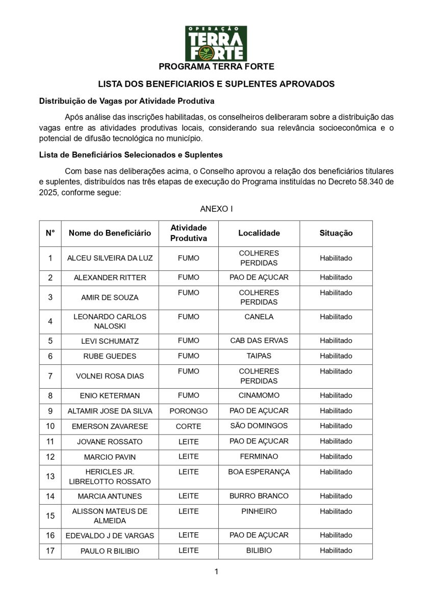 Lista disponível para dowload: /Im4g3nsN0t1cia/geral/files/LISTA_HABILITADOS_E_SUPLENTES_TERRA_FORTE_(1).docx