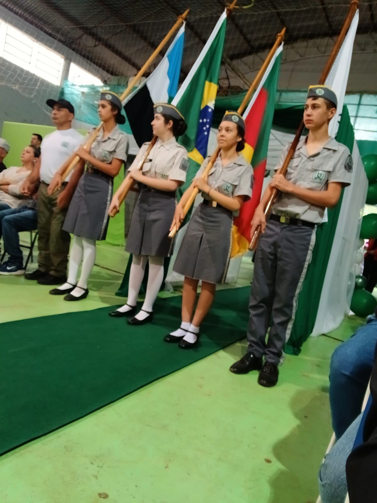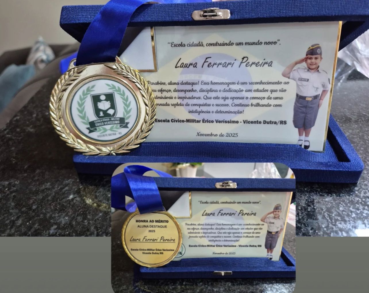 A Escola Municipal Ensino Fundamental Cívico-Militar Érico Veríssimo realizou nesta sexta-feira, 7, uma cerimônia de entrega dos casquetes aos novos alunos do ano letivo de 2025 e a premiação dos alunos destaques do segundo semestre do ano. O evento contou com a presença de professores, familiares, equipe gestora, monitores militares e autoridades locais, que prestigiaram um momento de grande significado para a comunidade escolar.