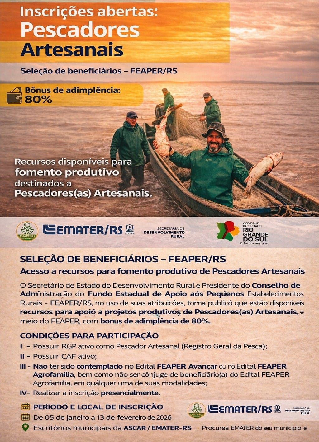 Pescadores e pescadoras artesanais de Vicente Dutra podem se inscrever, de 5 de janeiro a 13 de fevereiro de 2026, na seleção de beneficiários do Fundo Estadual de Apoio aos Pequenos Estabelecimentos Rurais (FEAPER/RS), que disponibiliza recursos para fomento produtivo da pesca artesanal, com bônus de adimplência de 80%. As inscrições devem ser realizadas presencialmente no Escritório Municipal da EMATER/RS-ASCAR.