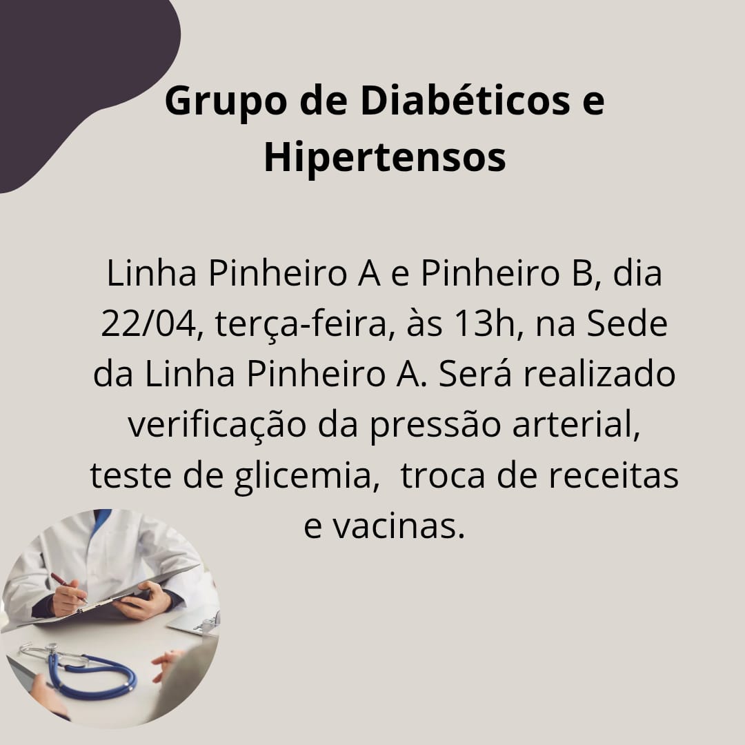 Linha Pinheiro A e Pinheiro B, dia 22/04, terça-feira, às 13h, na Sede da Linha Pinheiro A. Será realizado verificação da pressão arterial, teste de glicemia, troca de receitas e vacinas.